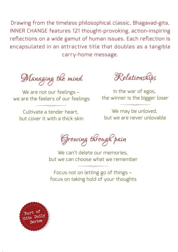 Inner Change presents 121 thoughtful reflections drawn from the Bhagavad Gita, offering practical guidance on the mind, relationships, and personal growth.